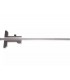 Depth measuring monoblock caliper in hardened stainless steel. Satin-chromed readout scale. Etched, precision graduation, easy to read and long-lasting. Raised slider for easy movement. Slider locking screw with micrometric adjustment. With interchangeable carbide foot (2 mm x L 10 mm). Serial number. Manufactured as per DIN 862. Supplied in case.