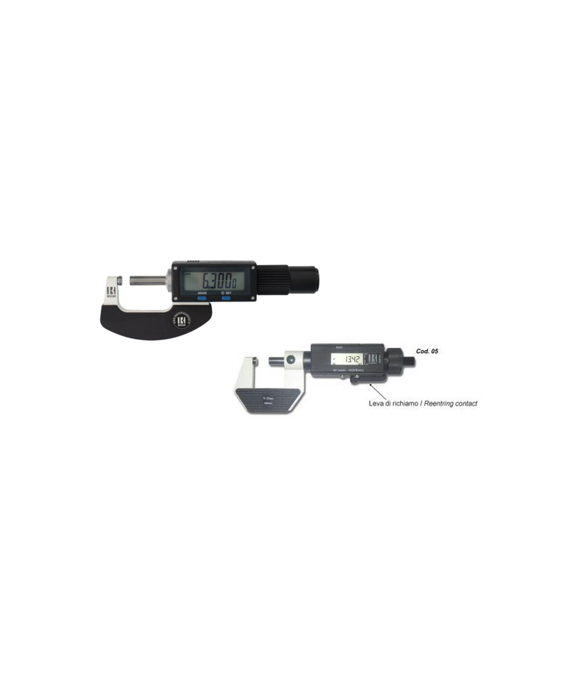 High quality/accuracy digital outside micrometer. Casting painted arc heat-insulated. Sylvac digital electronic components complete with output RS232 (enable the direct connection to PC). ON/OFF function – “0” setting in any position – SET – HOLD (memory) – PRESET – TOL (tolerance selection) – possibility for reading 0,001 mm - mm/inch conversion. Complete with friction and locking lever. Screw completely hardened and ground with specific working systems to assure the max accuracy for a long time. Serial number. Manufactured as per DIN 863. Supplied in a box with key and setting rod. Carbide contacts not rotating. Cod. 05 with 2 mm re-entering contact (comparative system). Upon requirement range till 300 mm.
